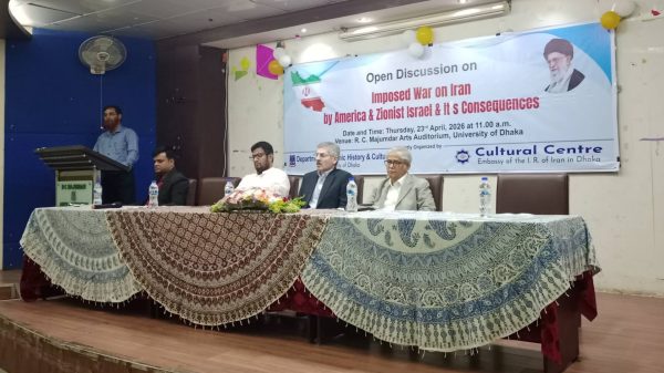 গত বৃহস্পতিবার ঢাকা বিশ্ববিদ্যালয়ের আরসি মজুমদার মিলনায়তনে ঢাকা বিশ্ববিদ্যালয়ের ইসলামের ইতিহাস ও সংস্কৃতি বিভাগ এবং ইরানিয়ান কালচারাল সেন্টারের যৌথ উদ্যোগে ইরানের ওপর আরোপিত যুদ্ধ ও এর পরিণতি বিষয়ে উন্মুক্ত আলোচনা অনুষ্ঠিত হয়েছে। অনুষ্ঠানে প্রধান আলোচক হিসেবে উপস্থিত ছিলেন সাইয়্যেদ রেজা